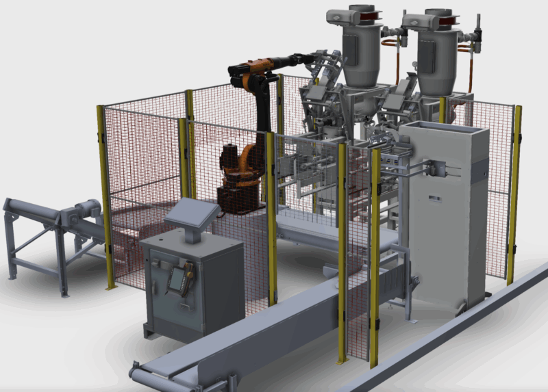 Elevation’s Robotic Valve Bag Placer automatically places bags on the fill spout and can be used with almost any valve bag filler including sonic sealed valve bags or standard pressure closed valve bags.  The Kuka KR16 / KR20 robot is programmed to interface with our valve bag pick up system and is extremely compact and easy to operate.  Our valve bag placers can be customized for your application and can place bags on 1- 4 valve bag fillers depending on the spacing between them.   How does it work?  Operators load empty bags on our indexing bag magazine.  The valve bag pickup system performs the empty bag pick up and opening of either spouted valve bags (meant for sonic sealing or heat sealing) or standard pressure close valve bags.  The robot takes the bag and places it onto the available filler’s spout.  This completely automates the operation of a valve bag filling machine.